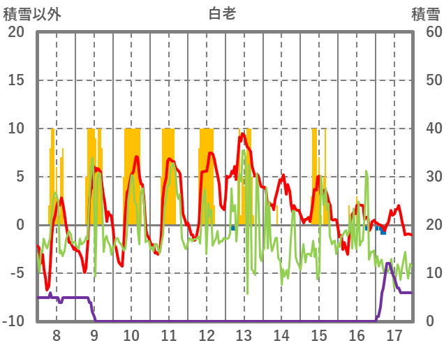 | 日 | 時 | 気温 | 降水 | 風向/風速 | 日照 | 積雪 | 降雪 |