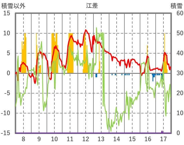 | 日 | 時 | 気温 | 降水 | 風向/風速 | 日照 | 積雪 | 降雪 |