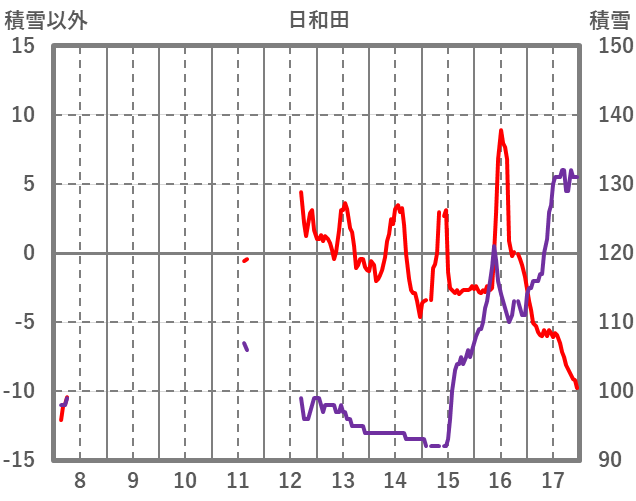 | 日 | 時 | 気温 | 降水 | 風向/風速 | 日照 | 積雪 | 降雪 |