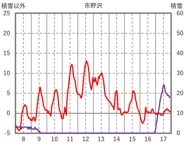 | 日 | 時 | 気温 | 降水 | 風向/風速 | 日照 | 積雪 | 降雪 |