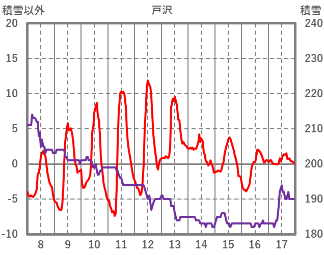| 日 | 時 | 気温 | 降水 | 風向/風速 | 日照 | 積雪 | 降雪 |