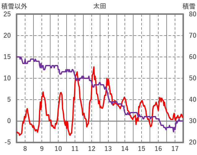 | 日 | 時 | 気温 | 降水 | 風向/風速 | 日照 | 積雪 | 降雪 |