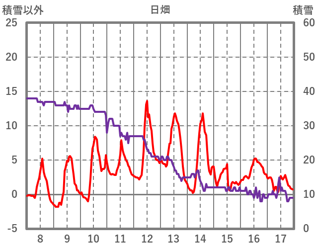 | 日 | 時 | 気温 | 降水 | 風向/風速 | 日照 | 積雪 | 降雪 |