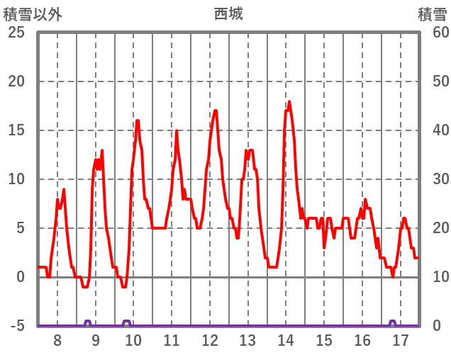 | 日 | 時 | 気温 | 降水 | 風向/風速 | 日照 | 積雪 | 降雪 |