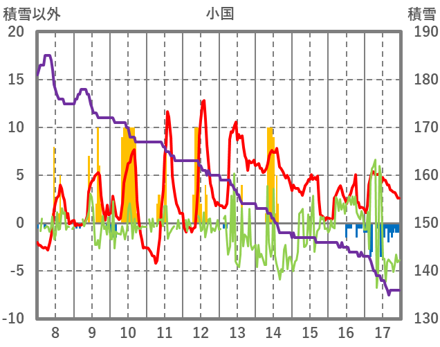 | 日 | 時 | 気温 | 降水 | 風向/風速 | 日照 | 積雪 | 降雪 |