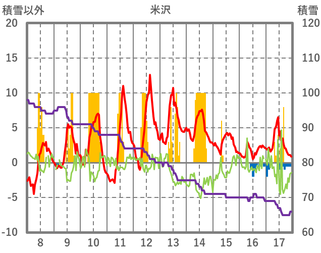 | 日 | 時 | 気温 | 降水 | 風向/風速 | 日照 | 積雪 | 降雪 |