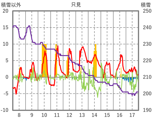 | 日 | 時 | 気温 | 降水 | 風向/風速 | 日照 | 積雪 | 降雪 |