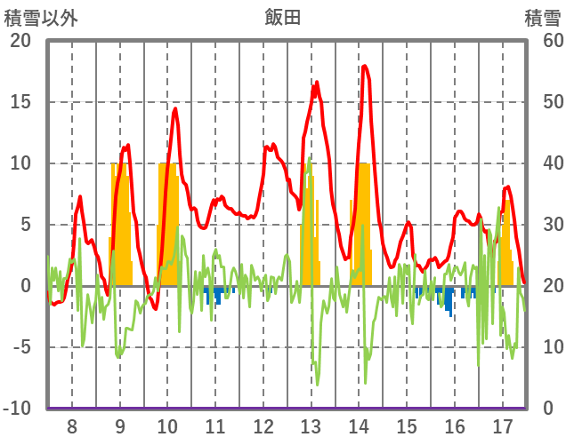 | 日 | 時 | 気温 | 降水 | 風向/風速 | 日照 | 積雪 | 降雪 |