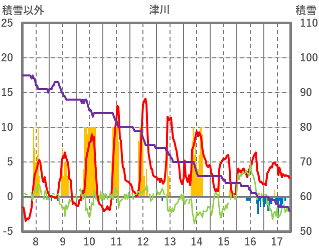 | 日 | 時 | 気温 | 降水 | 風向/風速 | 日照 | 積雪 | 降雪 |