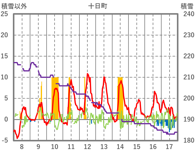| 日 | 時 | 気温 | 降水 | 風向/風速 | 日照 | 積雪 | 降雪 |