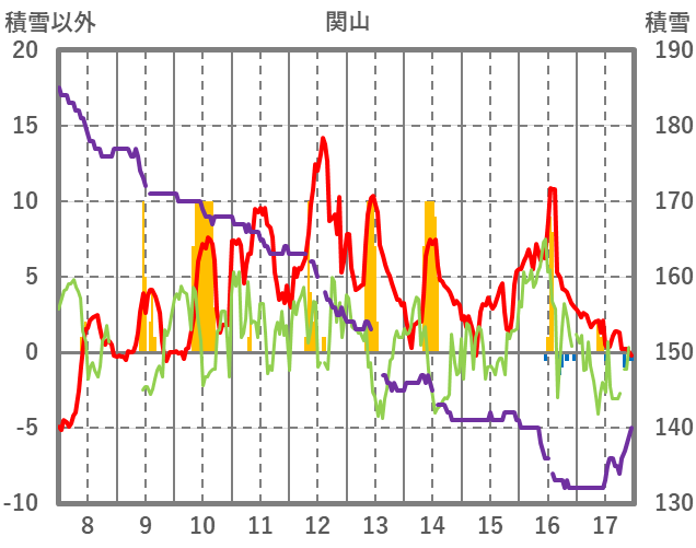 | 日 | 時 | 気温 | 降水 | 風向/風速 | 日照 | 積雪 | 降雪 |