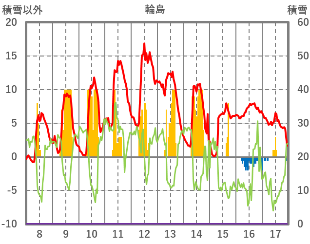 | 日 | 時 | 気温 | 降水 | 風向/風速 | 日照 | 積雪 | 降雪 |