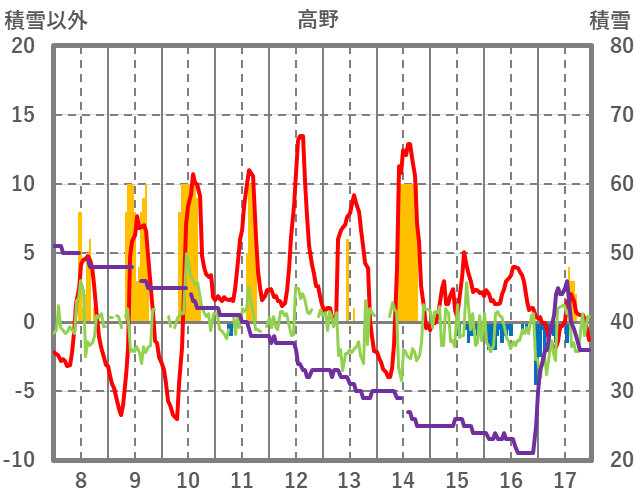 | 日 | 時 | 気温 | 降水 | 風向/風速 | 日照 | 積雪 | 降雪 |