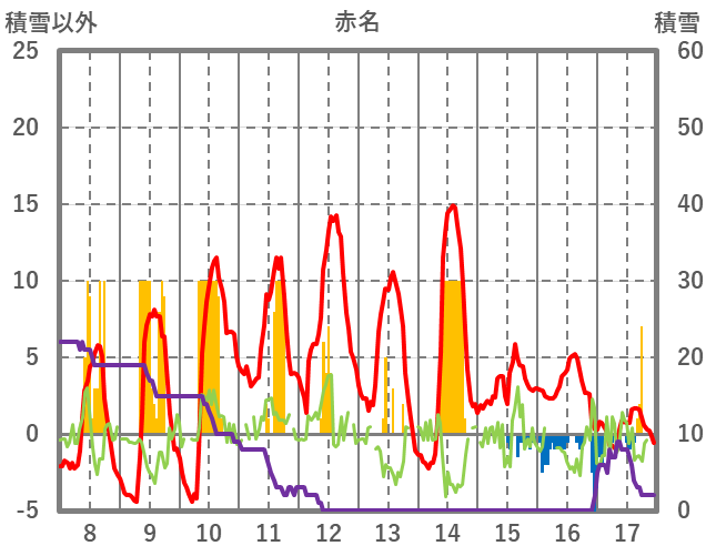 | 日 | 時 | 気温 | 降水 | 風向/風速 | 日照 | 積雪 | 降雪 |