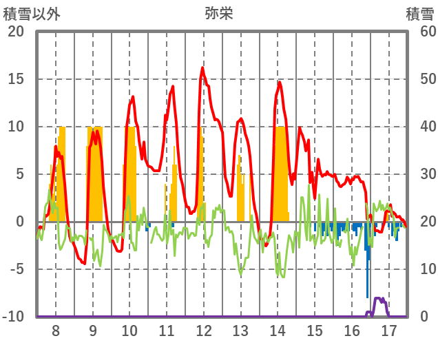 | 日 | 時 | 気温 | 降水 | 風向/風速 | 日照 | 積雪 | 降雪 |