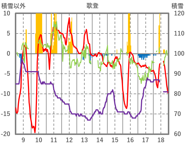 | 日 | 時 | 気温 | 降水 | 風向/風速 | 日照 | 積雪 | 降雪 |