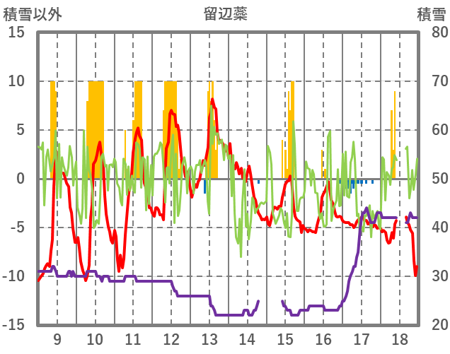 | 日 | 時 | 気温 | 降水 | 風向/風速 | 日照 | 積雪 | 降雪 |