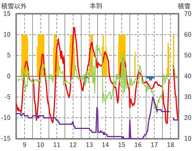 | 日 | 時 | 気温 | 降水 | 風向/風速 | 日照 | 積雪 | 降雪 |