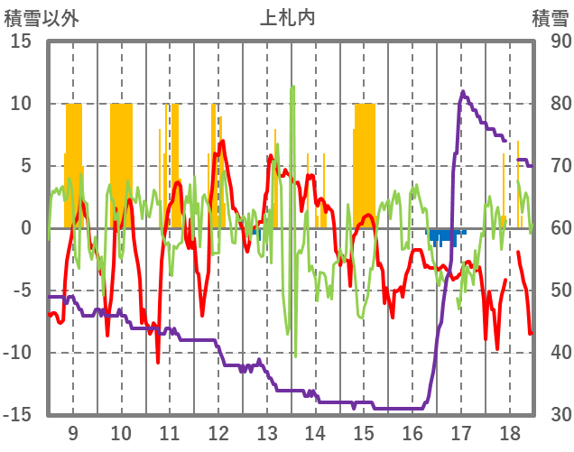 | 日 | 時 | 気温 | 降水 | 風向/風速 | 日照 | 積雪 | 降雪 |