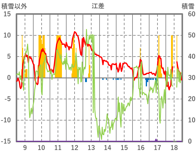 | 日 | 時 | 気温 | 降水 | 風向/風速 | 日照 | 積雪 | 降雪 |