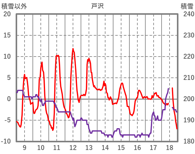 | 日 | 時 | 気温 | 降水 | 風向/風速 | 日照 | 積雪 | 降雪 |
