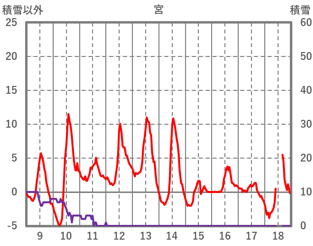 | 日 | 時 | 気温 | 降水 | 風向/風速 | 日照 | 積雪 | 降雪 |