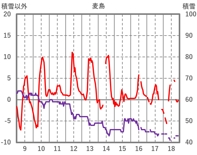 | 日 | 時 | 気温 | 降水 | 風向/風速 | 日照 | 積雪 | 降雪 |