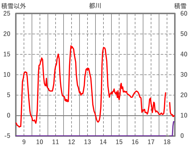 | 日 | 時 | 気温 | 降水 | 風向/風速 | 日照 | 積雪 | 降雪 |