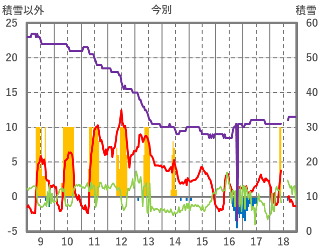 | 日 | 時 | 気温 | 降水 | 風向/風速 | 日照 | 積雪 | 降雪 |