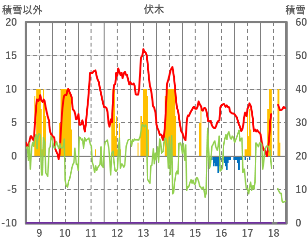 | 日 | 時 | 気温 | 降水 | 風向/風速 | 日照 | 積雪 | 降雪 |