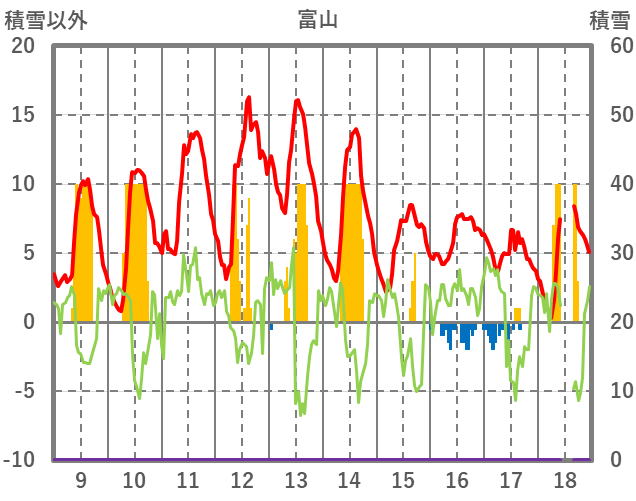 | 日 | 時 | 気温 | 降水 | 風向/風速 | 日照 | 積雪 | 降雪 |