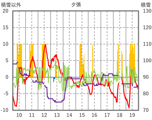 | 日 | 時 | 気温 | 降水 | 風向/風速 | 日照 | 積雪 | 降雪 |