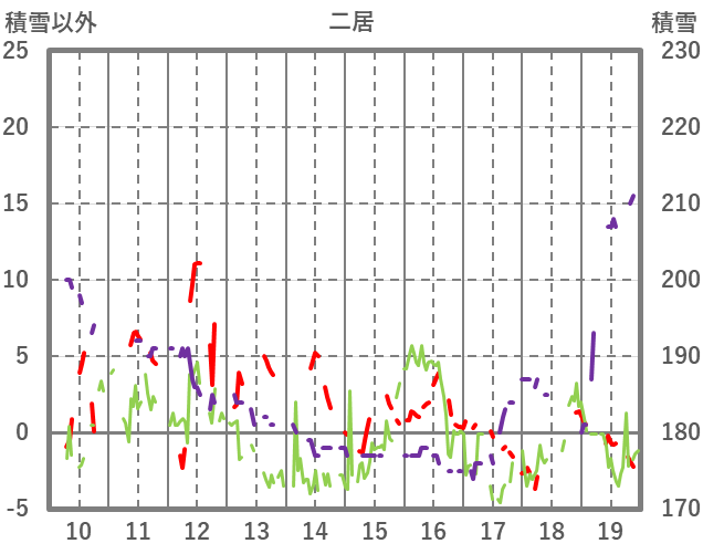 | 日 | 時 | 気温 | 降水 | 風向/風速 | 日照 | 積雪 | 降雪 |
