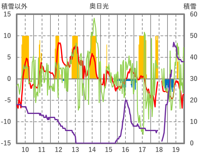 | 日 | 時 | 気温 | 降水 | 風向/風速 | 日照 | 積雪 | 降雪 |