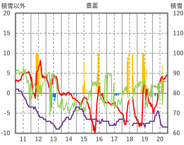 | 日 | 時 | 気温 | 降水 | 風向/風速 | 日照 | 積雪 | 降雪 |