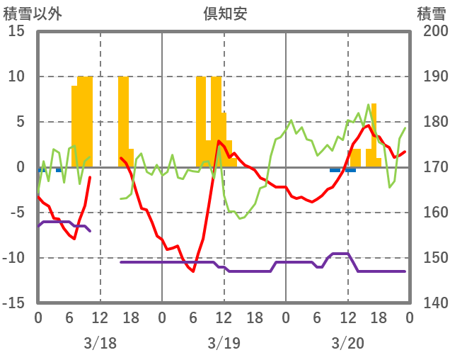 | 日 | 時 | 気温 | 降水 | 風向/風速 | 日照 | 積雪 | 降雪 |