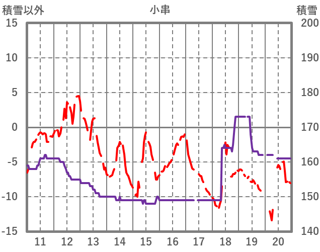 | 日 | 時 | 気温 | 降水 | 風向/風速 | 日照 | 積雪 | 降雪 |
