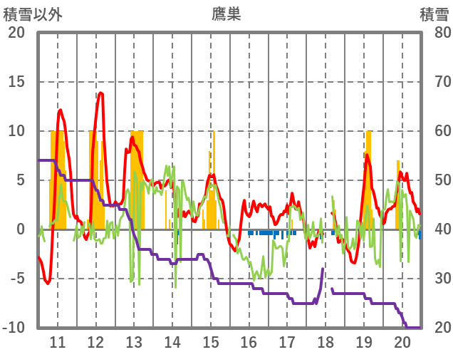 | 日 | 時 | 気温 | 降水 | 風向/風速 | 日照 | 積雪 | 降雪 |