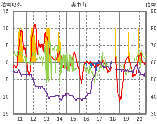 | 日 | 時 | 気温 | 降水 | 風向/風速 | 日照 | 積雪 | 降雪 |
