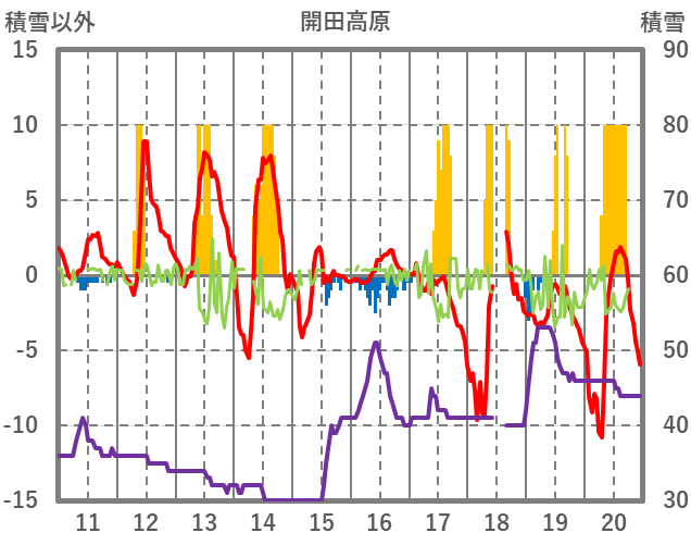 | 日 | 時 | 気温 | 降水 | 風向/風速 | 日照 | 積雪 | 降雪 |