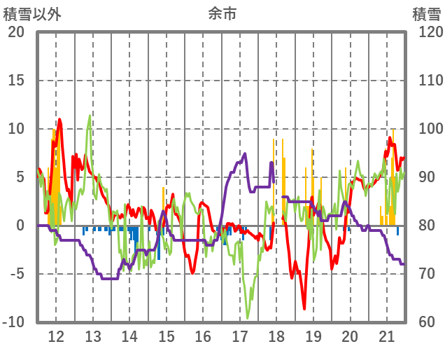 | 日 | 時 | 気温 | 降水 | 風向/風速 | 日照 | 積雪 | 降雪 |