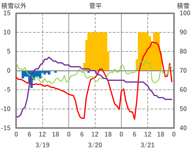 | 日 | 時 | 気温 | 降水 | 風向/風速 | 日照 | 積雪 | 降雪 |