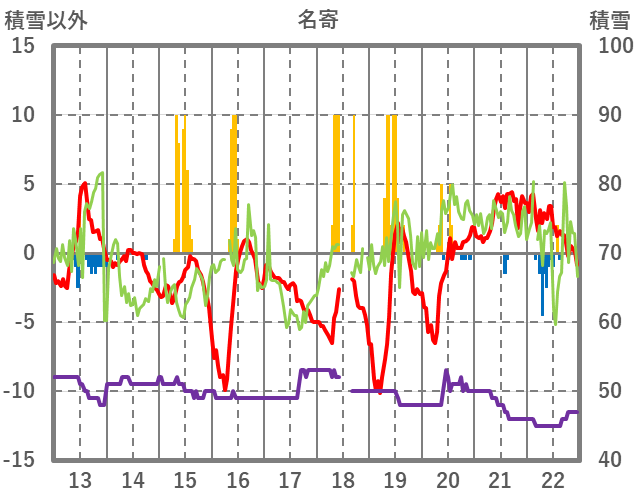 | 日 | 時 | 気温 | 降水 | 風向/風速 | 日照 | 積雪 | 降雪 |