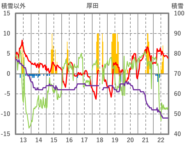 | 日 | 時 | 気温 | 降水 | 風向/風速 | 日照 | 積雪 | 降雪 |