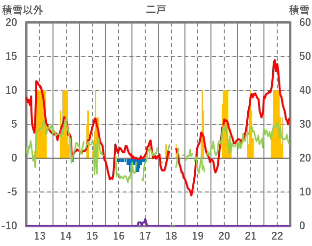 | 日 | 時 | 気温 | 降水 | 風向/風速 | 日照 | 積雪 | 降雪 |