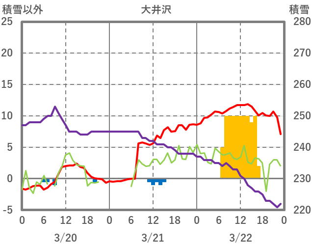 | 日 | 時 | 気温 | 降水 | 風向/風速 | 日照 | 積雪 | 降雪 |