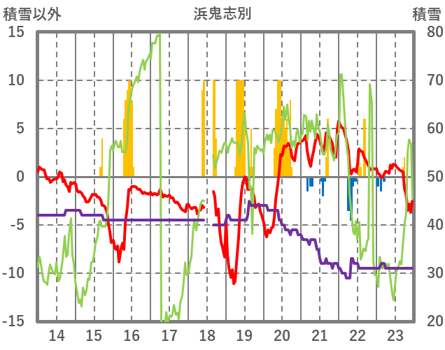 | 日 | 時 | 気温 | 降水 | 風向/風速 | 日照 | 積雪 | 降雪 |