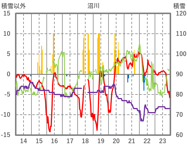 | 日 | 時 | 気温 | 降水 | 風向/風速 | 日照 | 積雪 | 降雪 |
