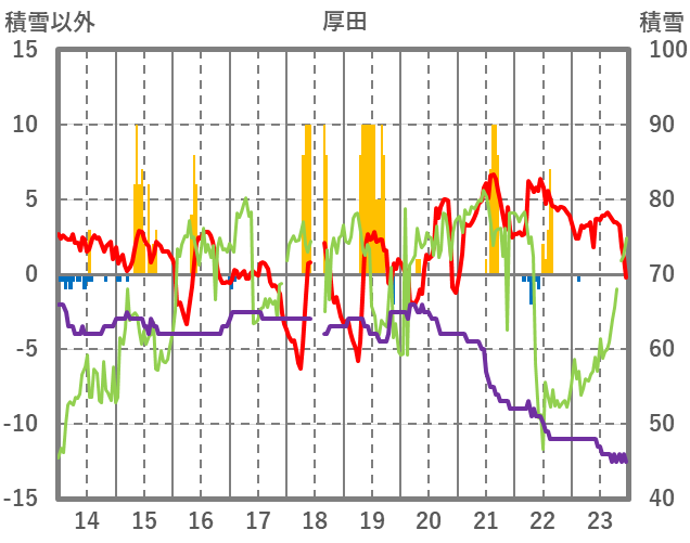 | 日 | 時 | 気温 | 降水 | 風向/風速 | 日照 | 積雪 | 降雪 |