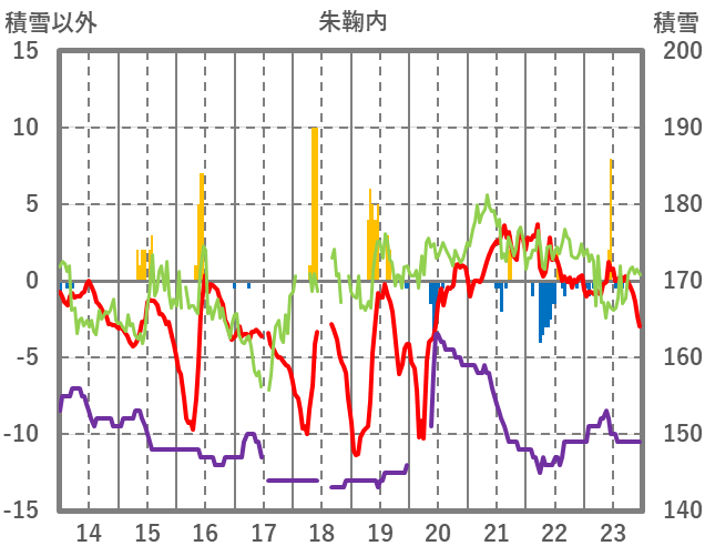 | 日 | 時 | 気温 | 降水 | 風向/風速 | 日照 | 積雪 | 降雪 |